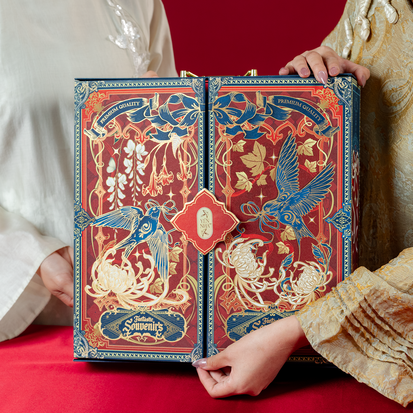 Hộp quà thiết kế sang trọng, họa tiết chim én bay lượn trên nền đỏ – xanh nổi bật