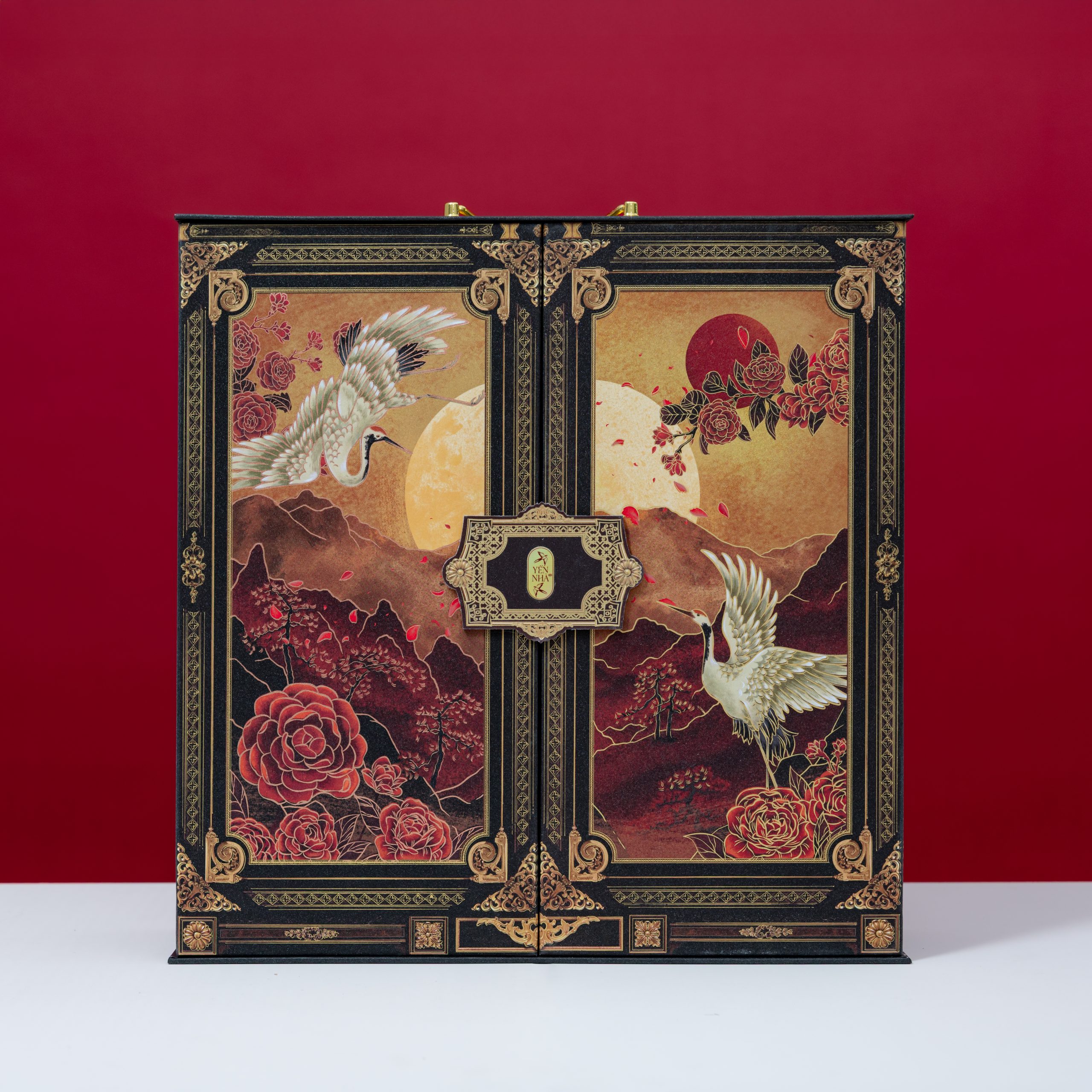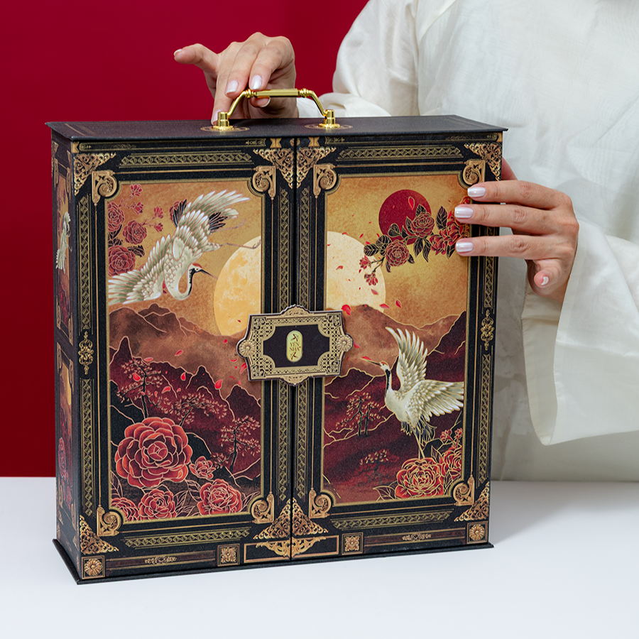 Bộ hộp Tiên Hạc là một tuyệt tác mang cảm hứng Đông phương thanh nhã. Họa tiết tiên hạc bay giữa nền sắc đỏ trầm, điểm xuyết hoa và các đường nét trang trí tinh xảo, được chế tác tỉ mỉ đến từng chi tiết. Tổng thể vừa gợi không khí Tết truyền thống, vừa toát lên vẻ sang trọng – đẳng cấp, phù hợp làm quà biếu trang nhã và đầy ý nghĩa.