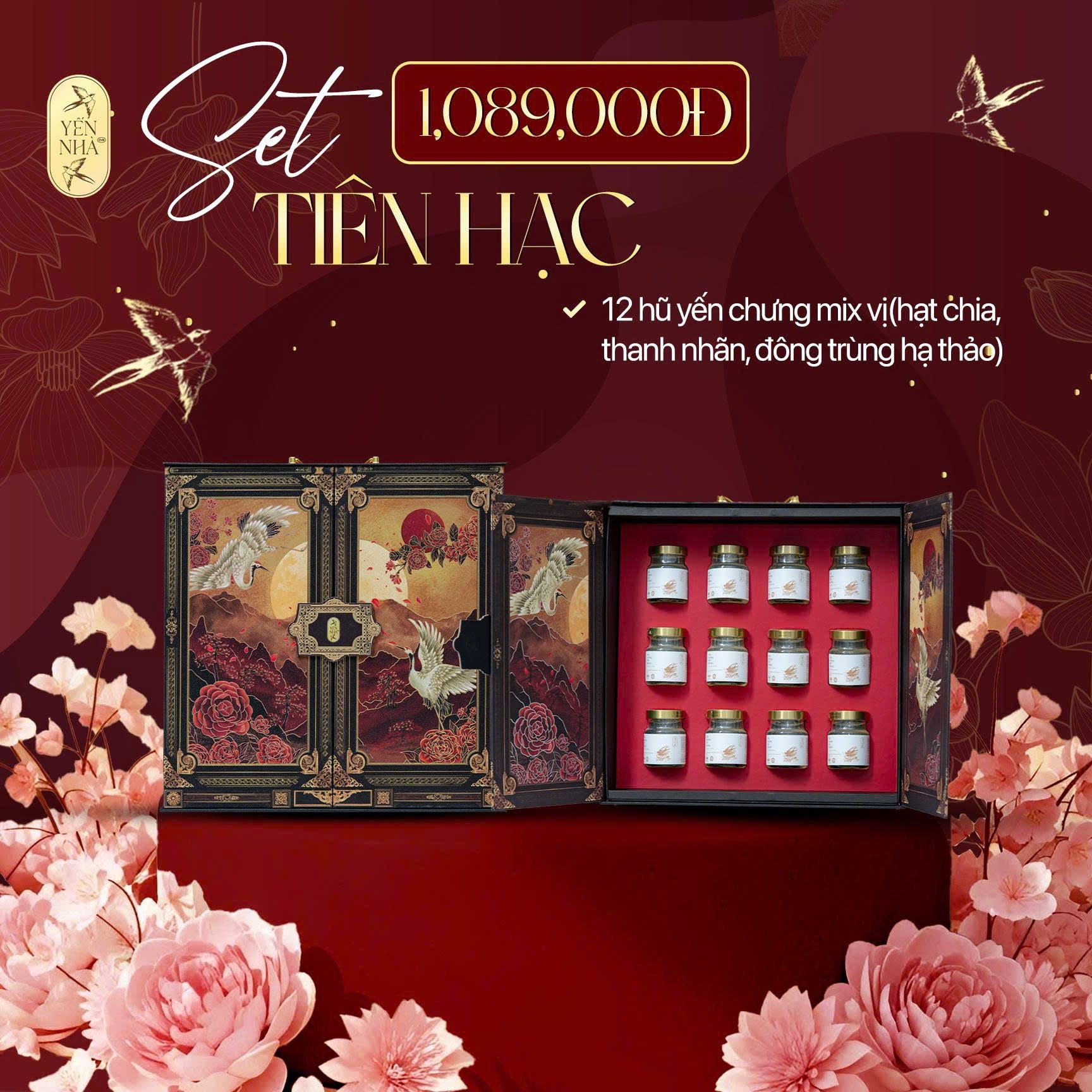 Với thiết kế Tiên Hạc tinh xảo và chất lượng yến chưng thượng hạng, set quà gồm 12 hũ yến chưng mix vị (Thanh Nhãn – Hạt Chia – Đông Trùng Hạ Thảo). Trang trọng khi trao tay, ấm áp khi nhận về — lý tưởng để biếu đối tác, gia đình trong dịp Tết.
